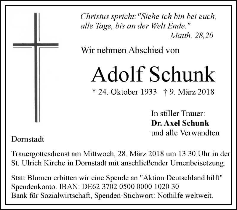 Hier finden Sie alle Traueranzeigen aus der Zeitung, die bisher für Adolf Schunk erschienen sind. Weitere Traueranzeigen, die in der Zeitung erscheinen, werden hier ebenfalls aufgelistet