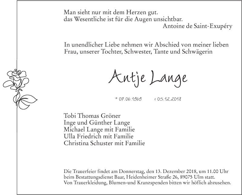 Hier finden Sie alle Traueranzeigen aus der Zeitung, die bisher für Antje Lange erschienen sind. Weitere Traueranzeigen, die in der Zeitung erscheinen, werden hier ebenfalls aufgelistet