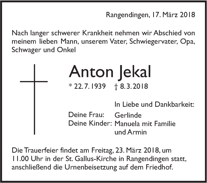 Hier finden Sie alle Traueranzeigen aus der Zeitung, die bisher für Anton Jekal erschienen sind. Weitere Traueranzeigen, die in der Zeitung erscheinen, werden hier ebenfalls aufgelistet