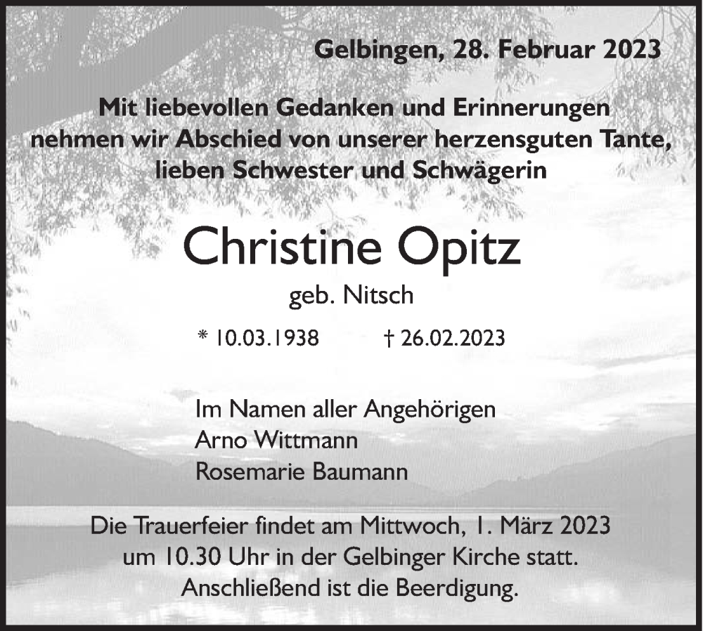 Hier finden Sie alle Traueranzeigen aus der Zeitung, die bisher für Christine Opitz erschienen sind. Weitere Traueranzeigen, die in der Zeitung erscheinen, werden hier ebenfalls aufgelistet