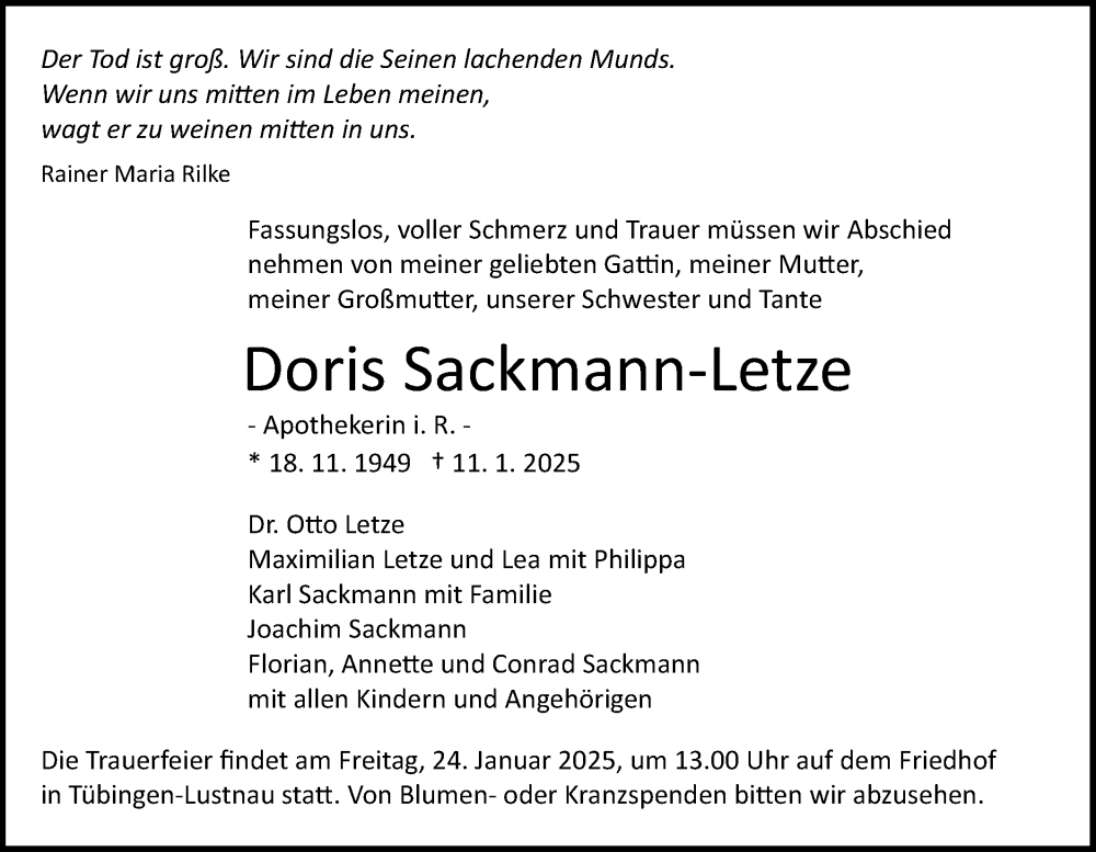 Hier finden Sie alle Traueranzeigen aus der Zeitung, die bisher für Doris Sackmann-Letze erschienen sind. Weitere Traueranzeigen, die in der Zeitung erscheinen, werden hier ebenfalls aufgelistet
