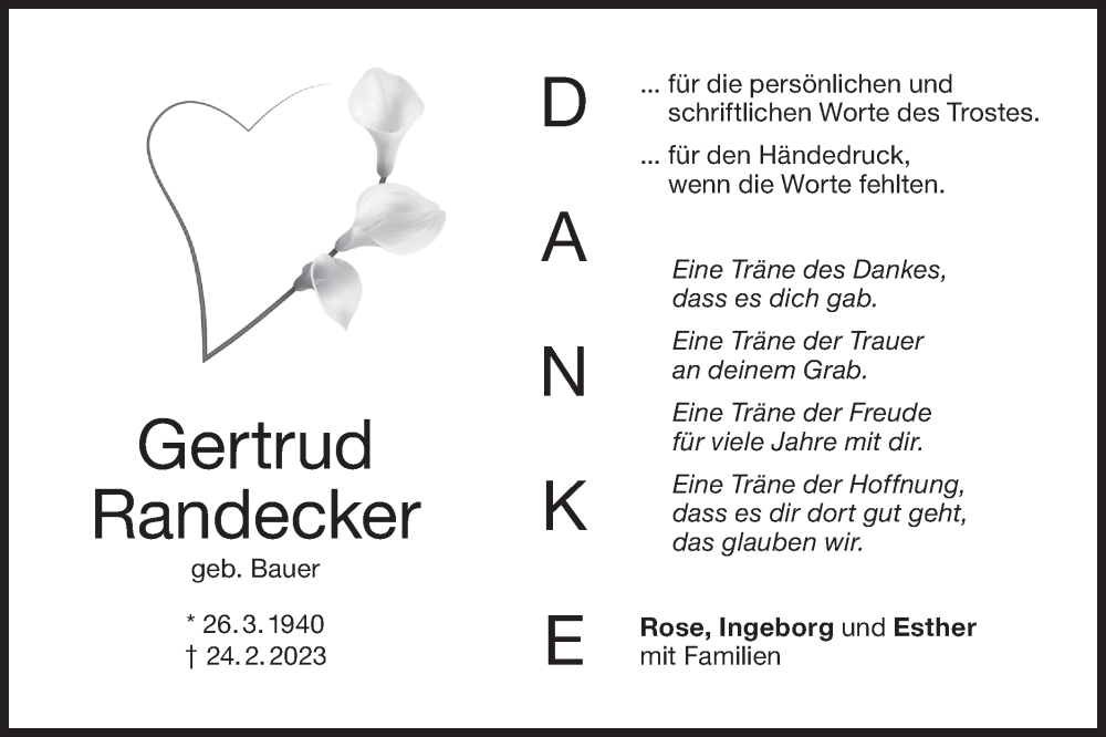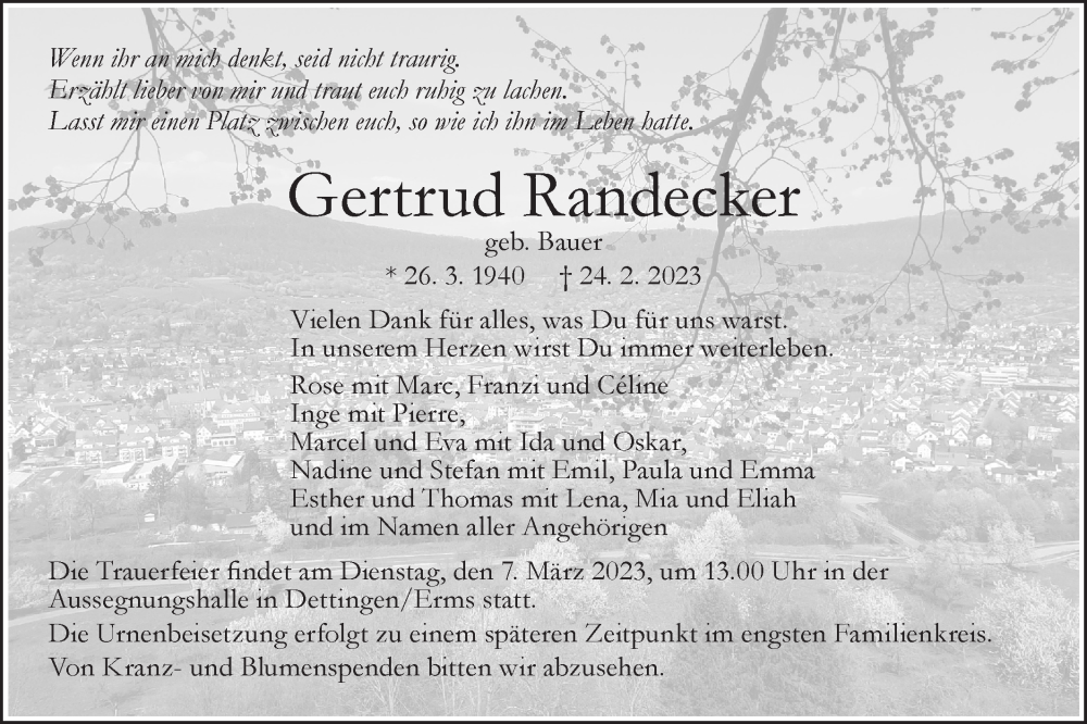 Hier finden Sie alle Traueranzeigen aus der Zeitung, die bisher für Gertrud Randecker erschienen sind. Weitere Traueranzeigen, die in der Zeitung erscheinen, werden hier ebenfalls aufgelistet
