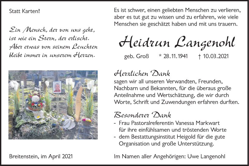 Hier finden Sie alle Traueranzeigen aus der Zeitung, die bisher für Heidrun Langenohl erschienen sind. Weitere Traueranzeigen, die in der Zeitung erscheinen, werden hier ebenfalls aufgelistet