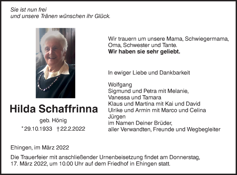 Hier finden Sie alle Traueranzeigen aus der Zeitung, die bisher für Hilda Schaffrinna erschienen sind. Weitere Traueranzeigen, die in der Zeitung erscheinen, werden hier ebenfalls aufgelistet