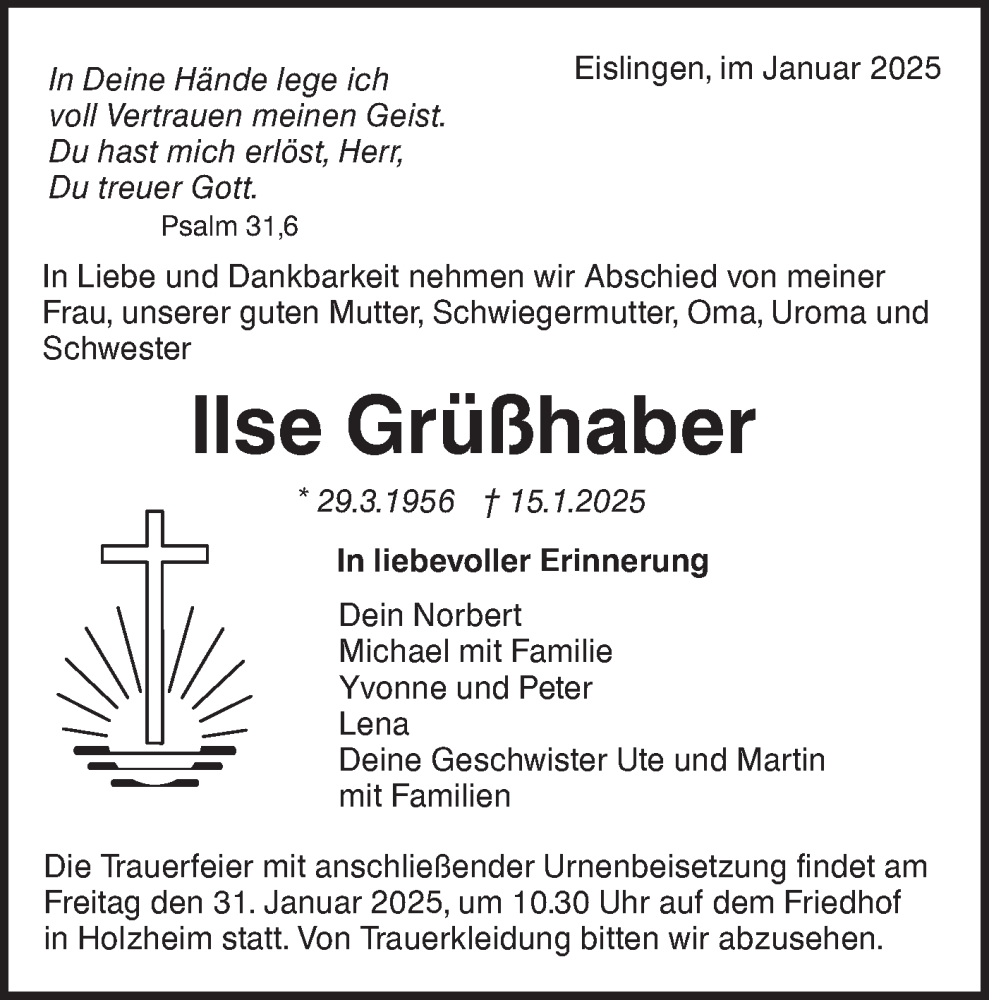 Hier finden Sie alle Traueranzeigen aus der Zeitung, die bisher für Ilse Grüßhaber erschienen sind. Weitere Traueranzeigen, die in der Zeitung erscheinen, werden hier ebenfalls aufgelistet
