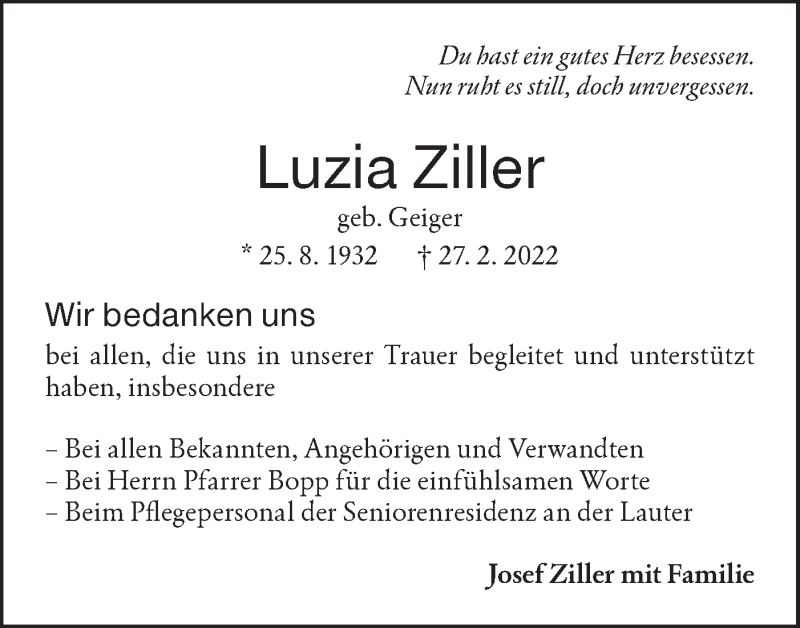 Hier finden Sie alle Traueranzeigen aus der Zeitung, die bisher für Luzia Ziller erschienen sind. Weitere Traueranzeigen, die in der Zeitung erscheinen, werden hier ebenfalls aufgelistet