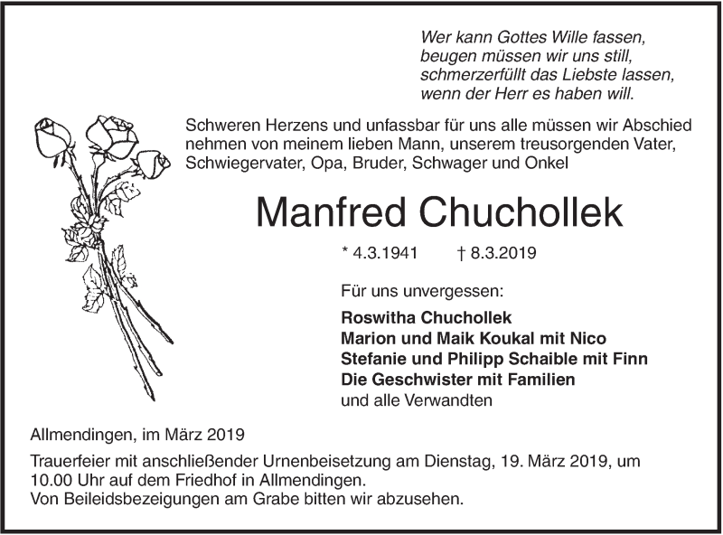 Hier finden Sie alle Traueranzeigen aus der Zeitung, die bisher für Manfred Chuchollek erschienen sind. Weitere Traueranzeigen, die in der Zeitung erscheinen, werden hier ebenfalls aufgelistet