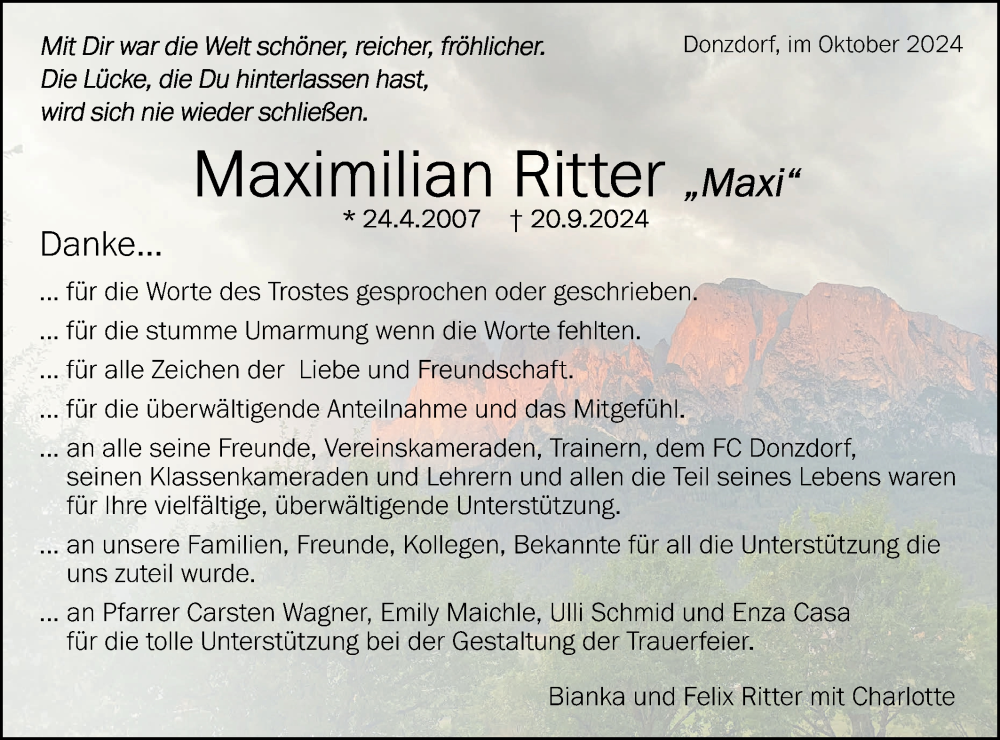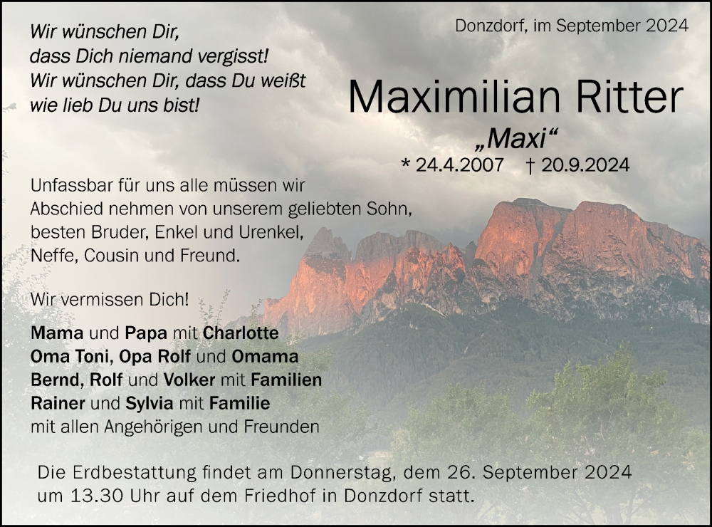 Hier finden Sie alle Traueranzeigen aus der Zeitung, die bisher für Maximilian Ritter erschienen sind. Weitere Traueranzeigen, die in der Zeitung erscheinen, werden hier ebenfalls aufgelistet