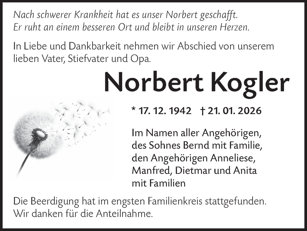 Hier finden Sie alle Traueranzeigen aus der Zeitung, die bisher für Norbert Kogler erschienen sind. Weitere Traueranzeigen, die in der Zeitung erscheinen, werden hier ebenfalls aufgelistet