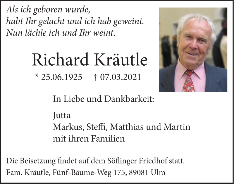 Hier finden Sie alle Traueranzeigen aus der Zeitung, die bisher für Richard Kräutle erschienen sind. Weitere Traueranzeigen, die in der Zeitung erscheinen, werden hier ebenfalls aufgelistet