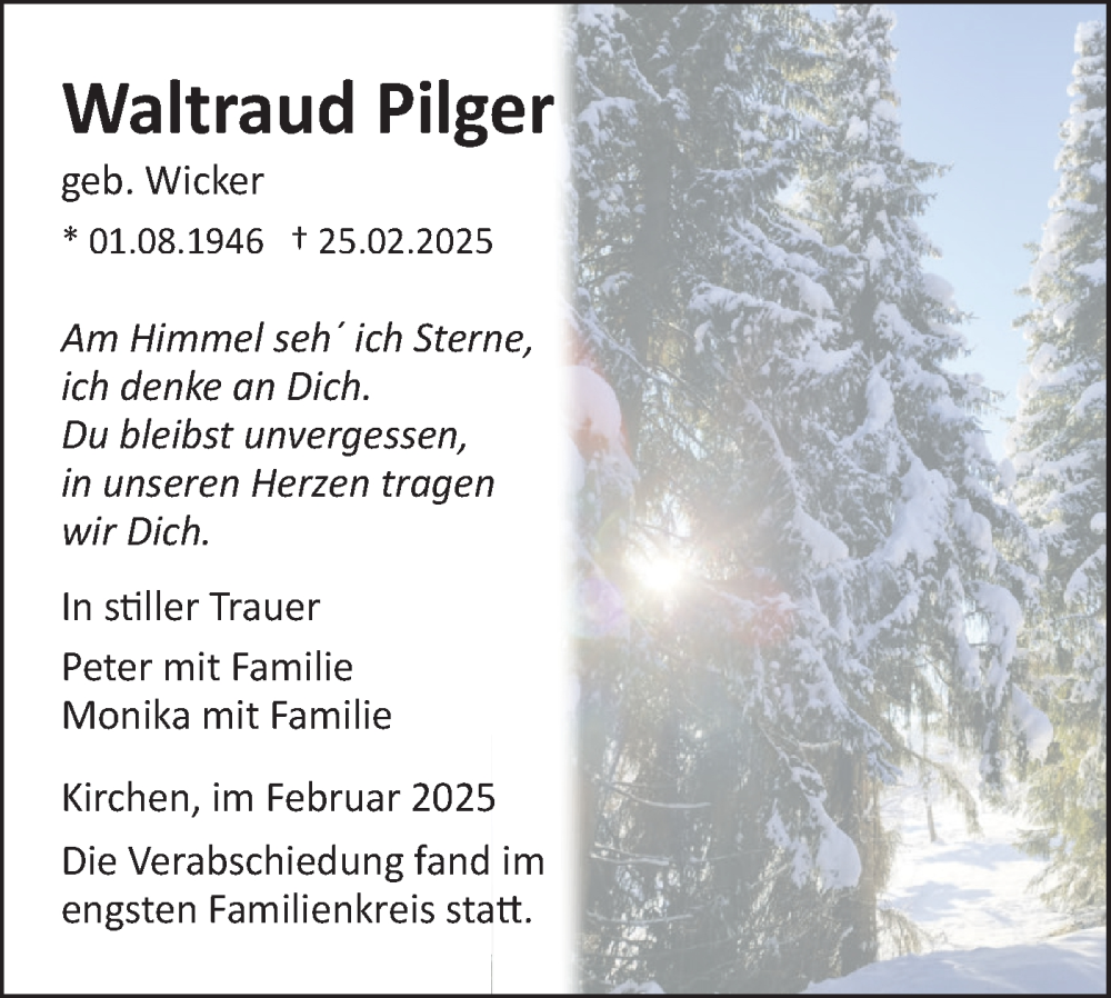 Hier finden Sie alle Traueranzeigen aus der Zeitung, die bisher für Waltraud Pilger erschienen sind. Weitere Traueranzeigen, die in der Zeitung erscheinen, werden hier ebenfalls aufgelistet
