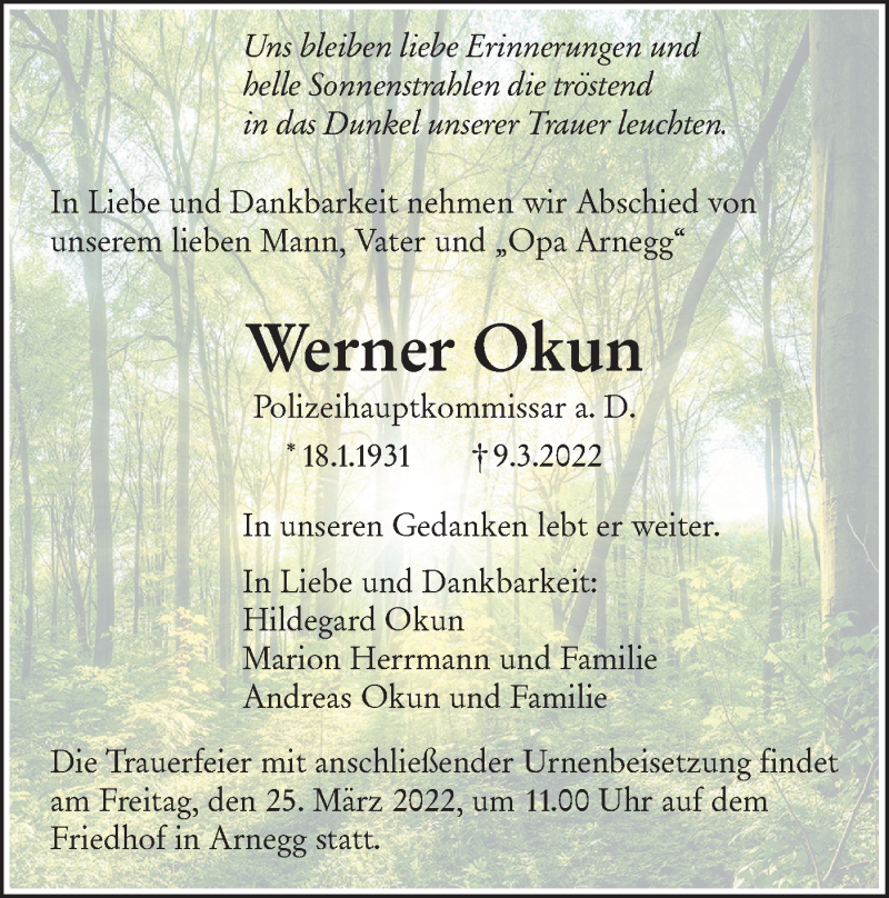 Hier finden Sie alle Traueranzeigen aus der Zeitung, die bisher für Werner Okun erschienen sind. Weitere Traueranzeigen, die in der Zeitung erscheinen, werden hier ebenfalls aufgelistet