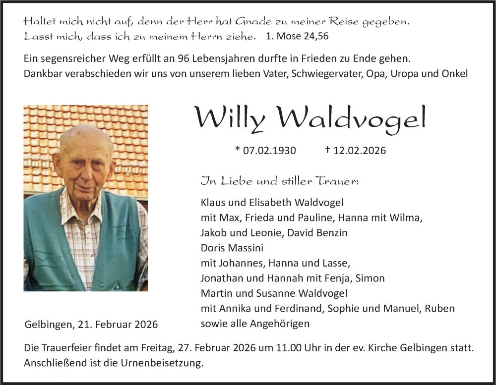 Hier finden Sie alle Traueranzeigen aus der Zeitung, die bisher für Willy Waldvogel erschienen sind. Weitere Traueranzeigen, die in der Zeitung erscheinen, werden hier ebenfalls aufgelistet